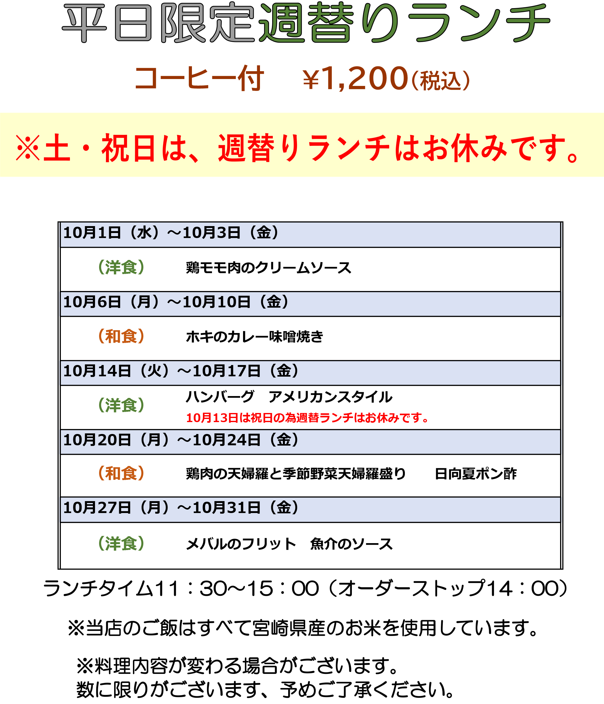 【レストラン】10月の平日限定週替りランチ♪
